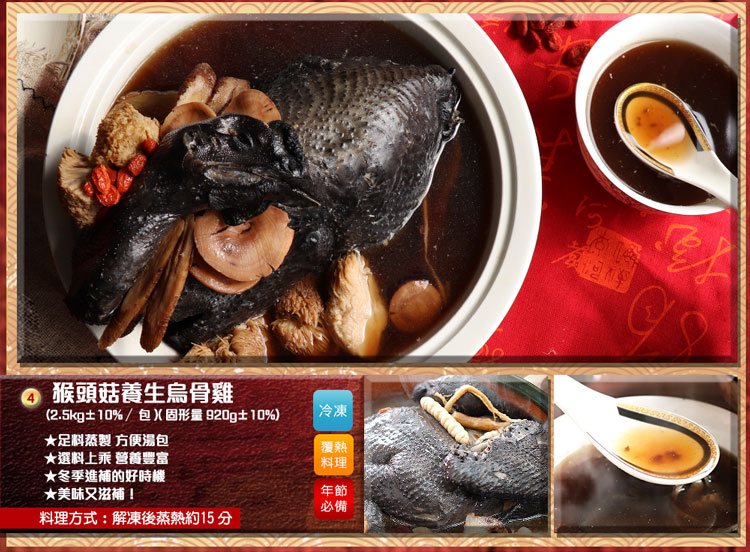 3.猴頭菇養生烏骨雞(2.5kg±10%/包,固形量920g±10%)