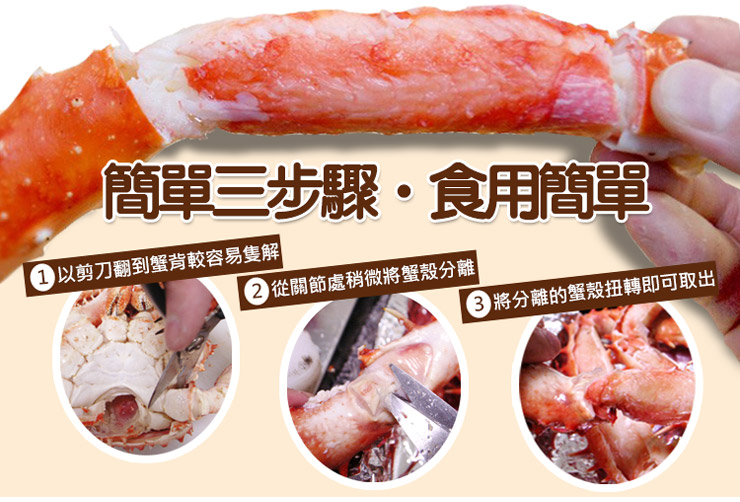 2. 帝王蟹火鍋料理:將帝王蟹腳放入火鍋湯中川燙約10~15秒既可食用,切勿長時間進入湯鍋熬煮,因為蟹的肉質與甜度會流失。