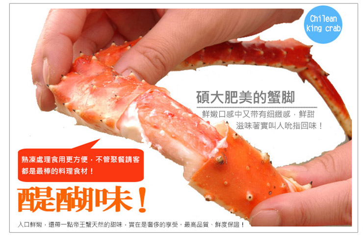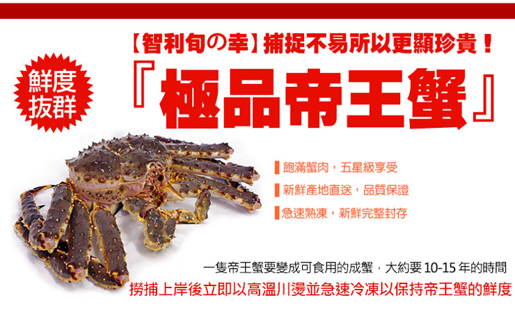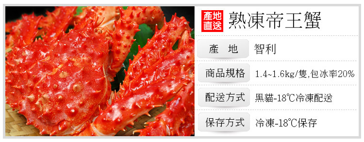 .商品名稱:特大級急凍智利帝王蟹1隻(1.4-1.6kg/隻)