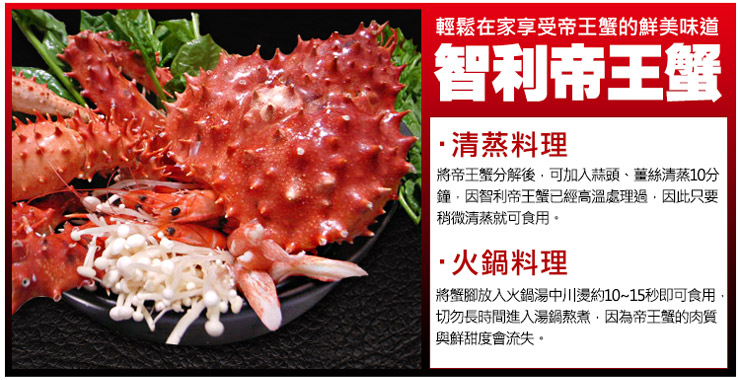 1. 帝王蟹清蒸料理:將帝王蟹分解後,可加入蒜頭、薑絲清蒸10分鐘,因智利帝王蟹以經高溫處理過,因此只要稍微清蒸就可食用。