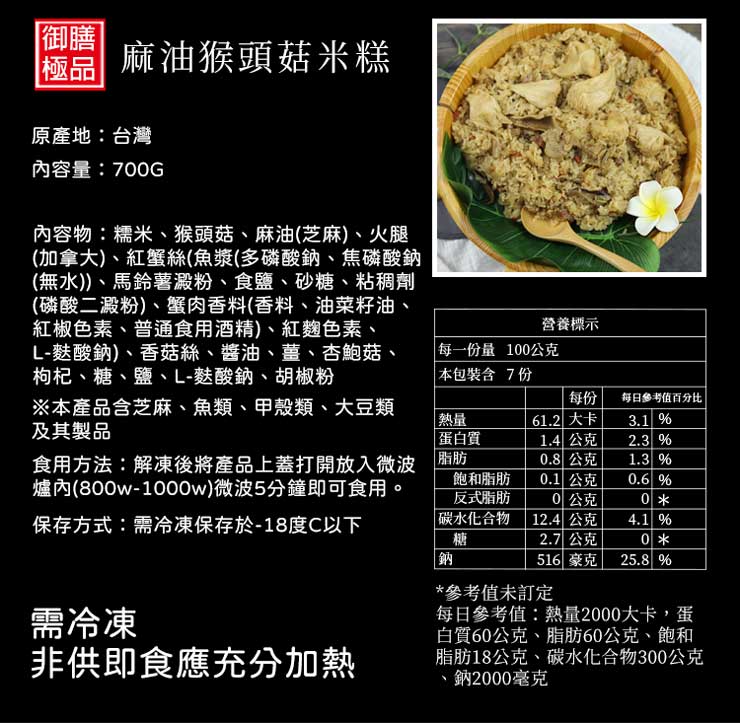 .內容物名稱:麻油猴頭米糕