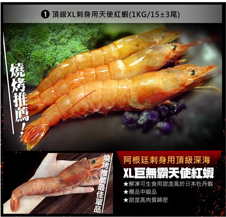 1.刺身XL天使紅蝦-1KG(15尾+-3尾)