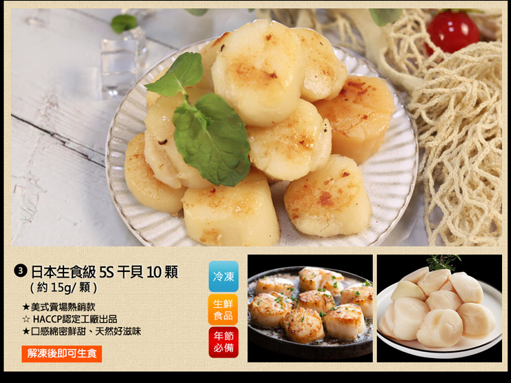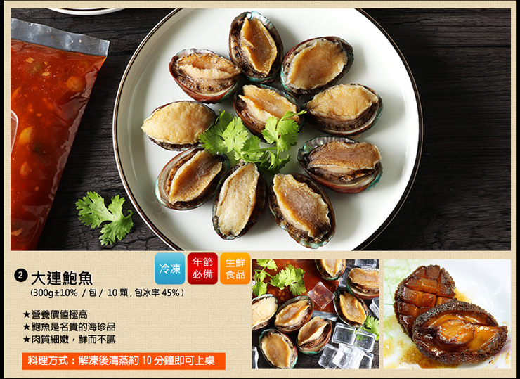 干貝、大連鮑魚(生鮮食品,食品烹煮至熟即可享用)