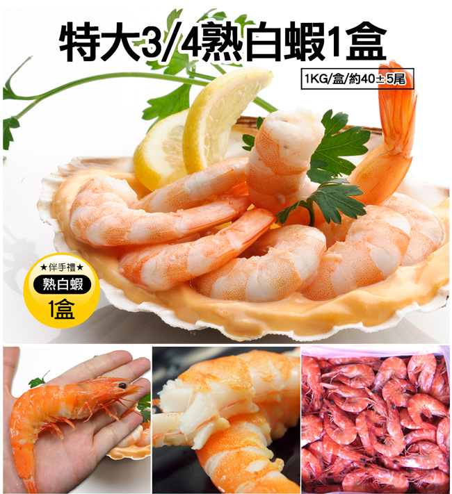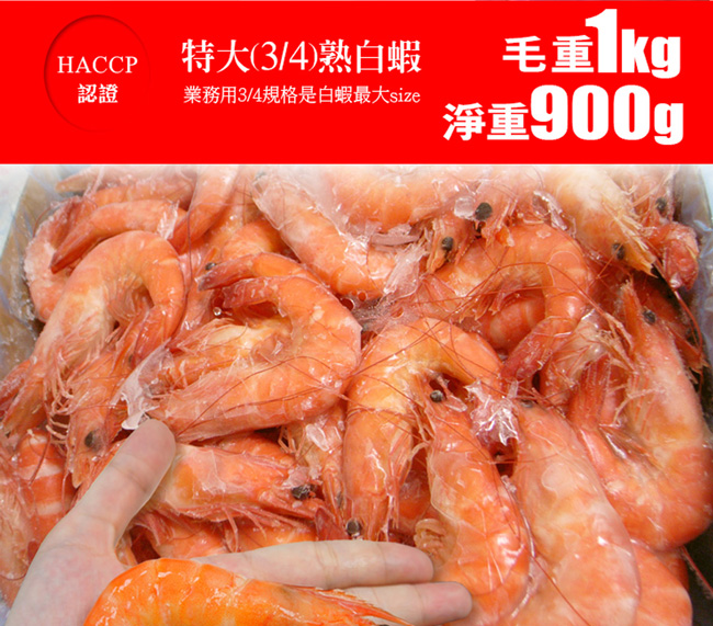 (3)特大3/4熟白蝦1盒(1kg±10%/盒/約40±5尾 /淨重900g)