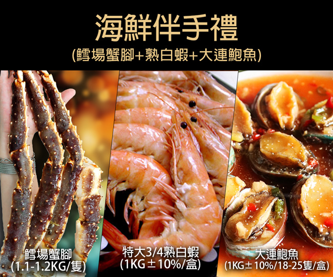●商品名稱:海鮮伴手禮|鱈場蟹腳+大連盤鮑+熟白蝦