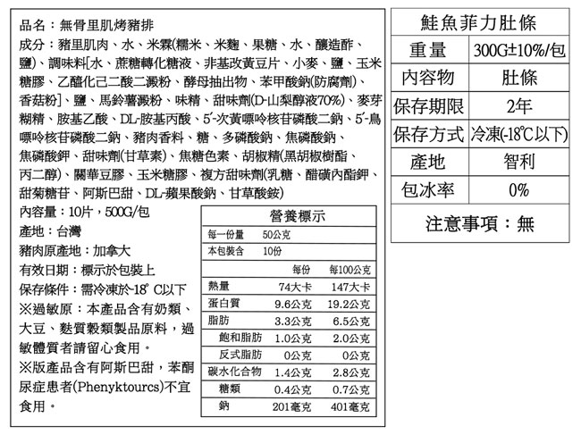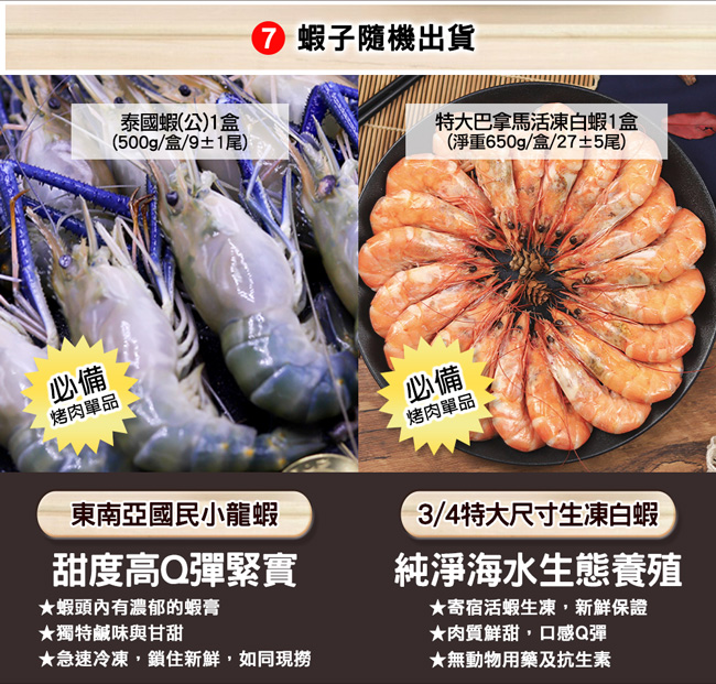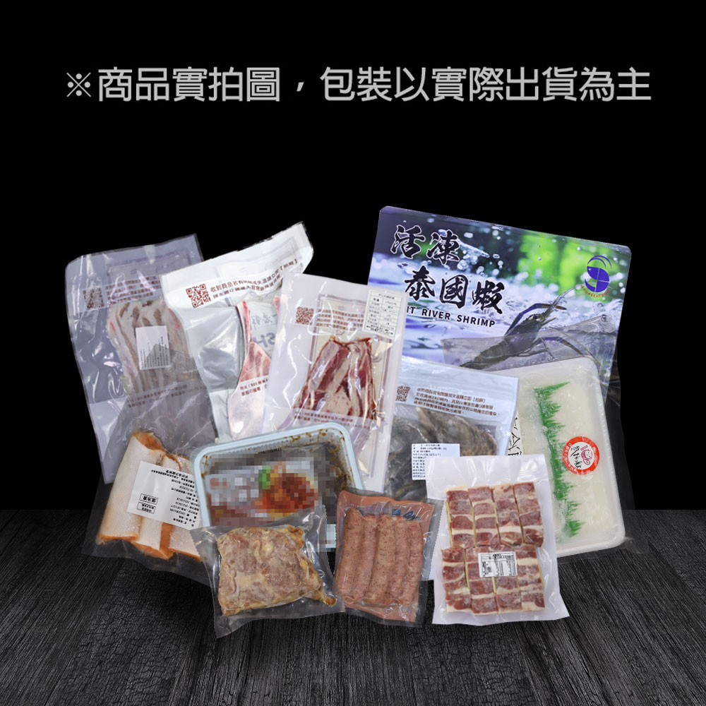 ‧●內容物名稱:里肌烤豬排、豬五花、生食花枝、飛魚卵香腸、鮭魚肚條、戰斧小豬排、泰國蝦&巴拿馬白蝦(隨機出貨)、雞腿排、