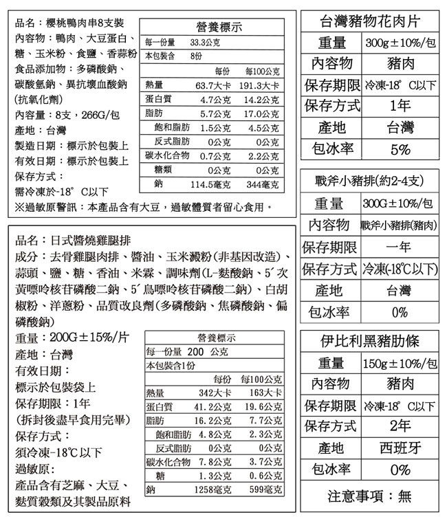 ‧●產地:里肌烤豬排(產地:台灣,豬肉原產地:加拿大)、豬五花(台灣)、生食花枝(越南)、飛魚卵香腸(台灣)、鮭魚肚條(智利)、戰斧小豬排(台灣)、泰國蝦(泰國)&巴拿馬白蝦(巴拿馬)-隨機出貨、醬燒雞腿排(台灣)、伊比利黑豬肋條(西班牙)、生蠔(日本)、櫻桃鴨肉串(台灣)