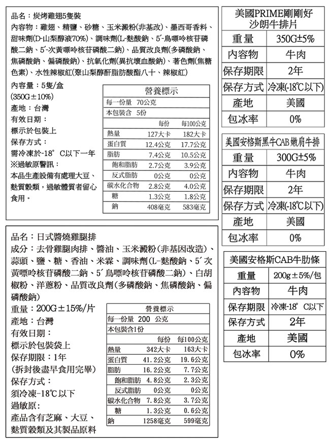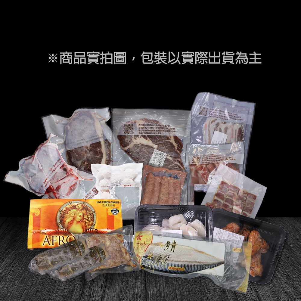 ‧●內容物名稱:沙朗牛排片、嫩肩牛排、鴨肉串、牛肋條、飛魚卵香腸、豬五花、雞腿排、雞翅、白蝦、5S干貝、梅花豬肉、龍蝦身、鯖魚、小花枝