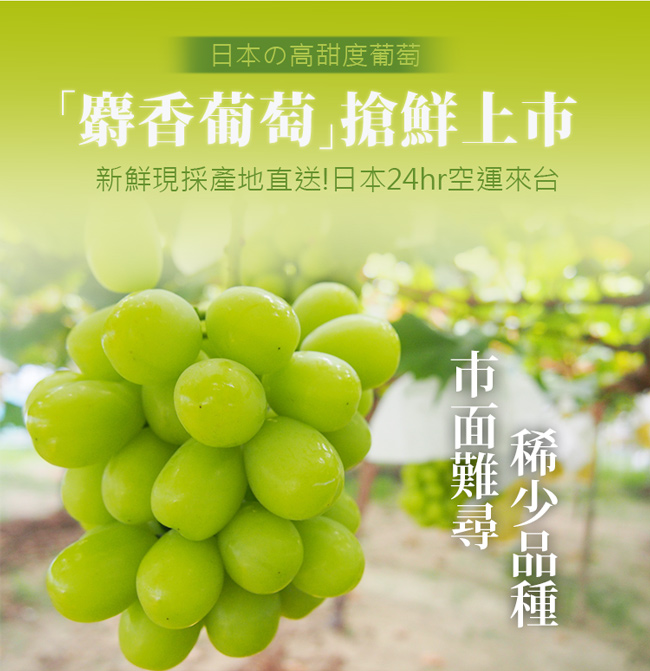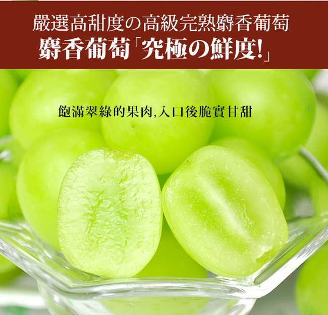 .商品名稱:日本空運超甜無籽麝香葡萄禮盒1串(350g/串) 免運