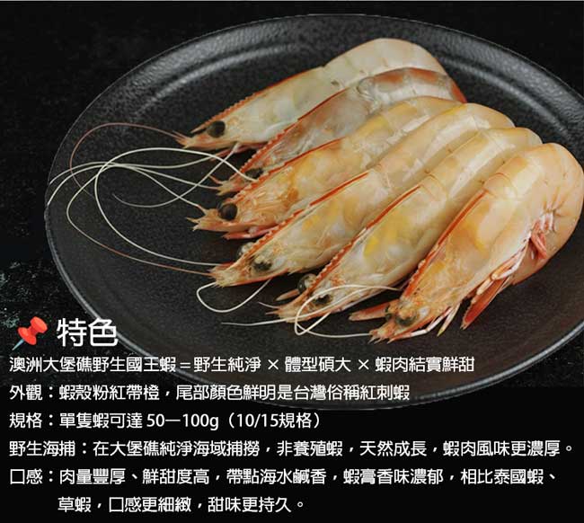 野生海捕:在大堡礁純淨海域捕撈,非養殖蝦,天然成長,蝦肉風味更濃厚。