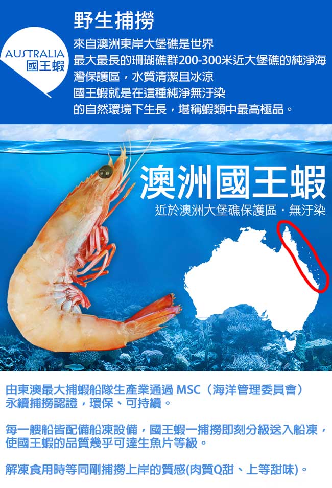 澳洲大堡礁野生國王蝦 = 野生純淨 × 體型碩大 × 蝦肉結實鮮甜