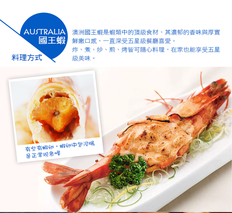.商品名稱:◎澳洲大堡礁野生國王蝦1包(500g/包/7±2尾)-任選