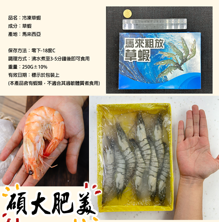 .商品名稱:馬來粗放草蝦8尾x5盒(250g/盒)