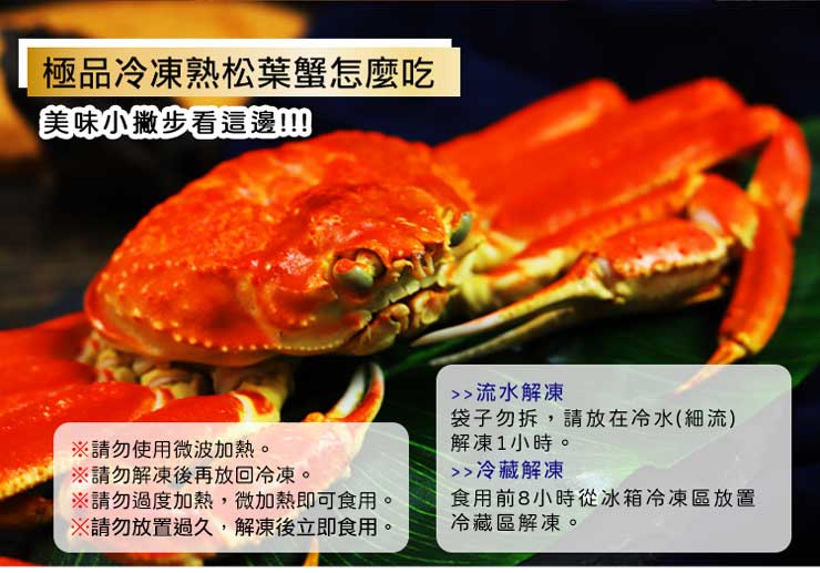 熟蟹解凍後用於火鍋、清蒸時、只需稍微川燙;加熱既可(過度烹煮會變柴)