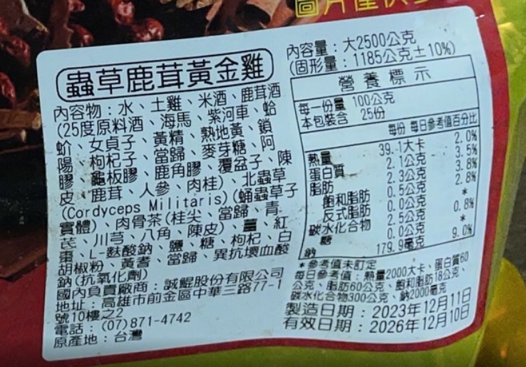 .商品名稱:蟲草黃金雞湯1包(2.5kg/包)