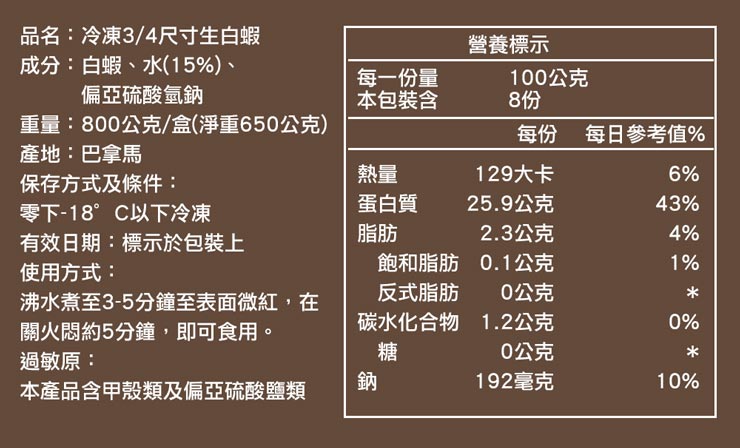 ‧●食品添加物:白蝦、水、偏亞硫酸氫鈉。過敏原:甲殼類.偏亞硫酸鹽類。如圖所示(依實際到貨外包裝為主)